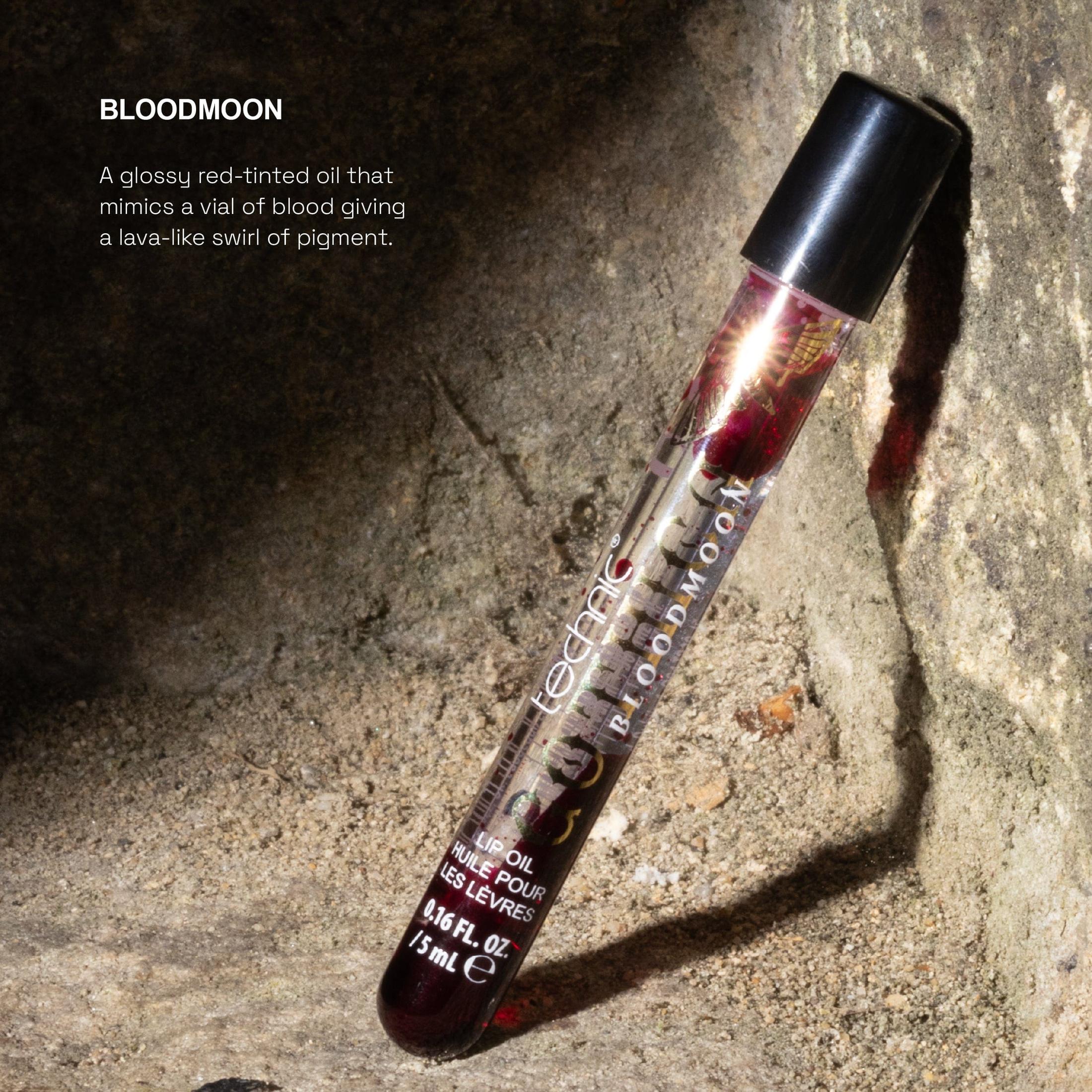 ✨ Bloodmoon – A glossy red-tinted oil that mimics a vial of blood. Stir the wand through the oil and watch it transform into a lava-like swirl of crimson droplets. Wear alone for a touch of shine or layer over our Colour Changing Lip Balms or Matte Black Lipstick for a glossy, dimensional finish.