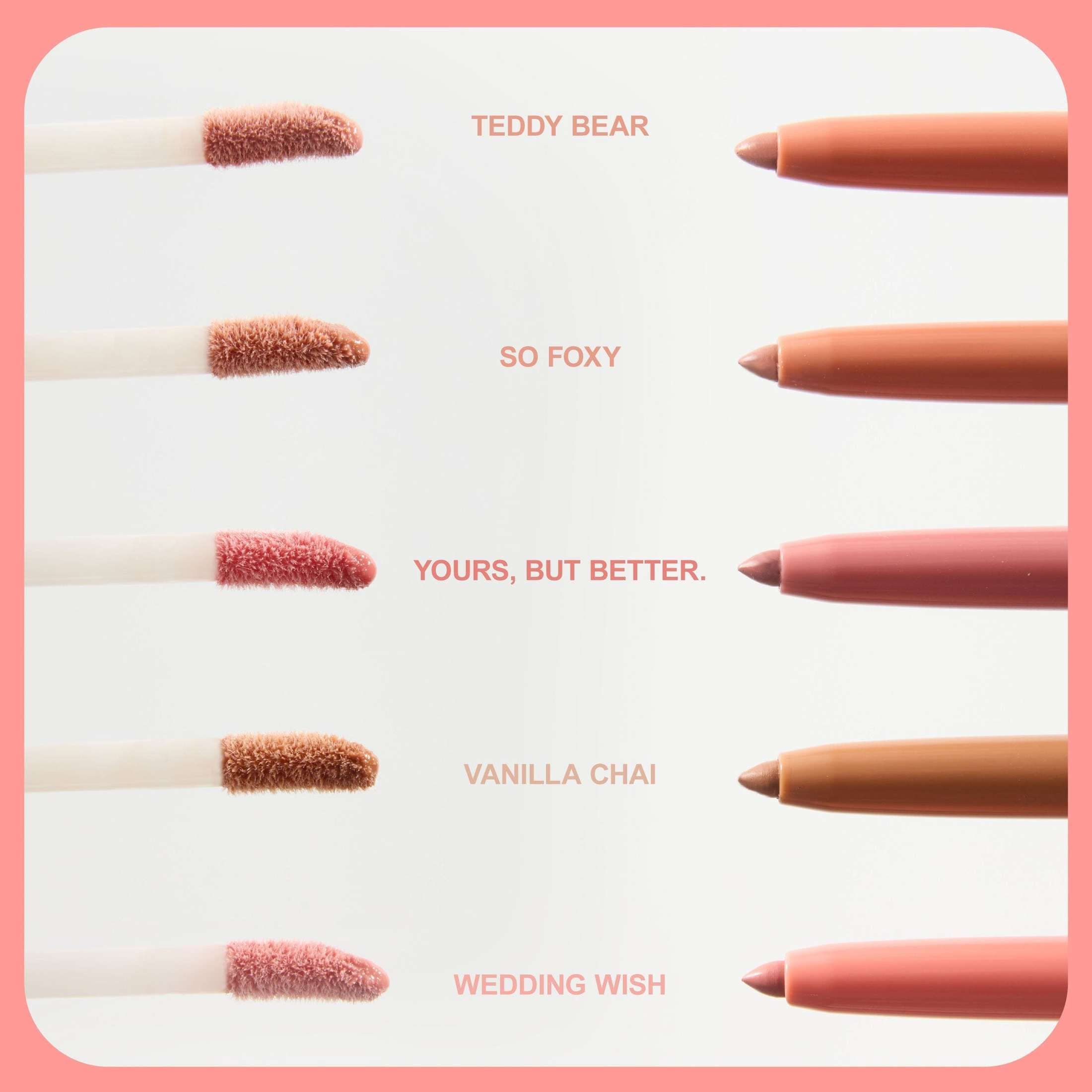 YOURS BUT BETTER - LIP GLOSS POLYISOBUTENE, ETHYLHEXYL PALMITATE, CAPRYLIC/CAPRIC TRIGLYCERIDE, HYDROGENATED STYRENE/ISOPRENE COPOLYMER, SILICA DIMETHYL SILYLATE, ISONONYL ISONONANOATE, PHENOXYETHANOL, TRIDECYL TRIMELLITATE, SIMMONDSIA CHINENSIS (JOJOBA) SEED OIL, HELIANTHUS ANNUUS (SUNFLOWER) SEED OIL, ROSA CANINA (ROSEHIP) FRUIT OIL, BUTYROSPERMUM PARKII (SHEA) BUTTER, TOCOPHERYL ACETATE, ETHYLHEXYLGLYCERIN, RICINUS COMMUNIS (CASTOR) SEED OIL, SODIUM HYALURONATE, ALUMINUM HYDROXIDE, PENTAERYTHRITYL TETRA-DI-T-BUTYL HYDROXYHYDROCINNAMATE, HYDROGENATED CASTOR OIL, CI 77891 (TITANIUM DIOXIDE), CI 77491 (IRON OXIDES), CI 15850 (RED 7 LAKE), CI 77499 (IRON OXIDES), CI 77492 (IRON OXIDES) YOURS BUT BETTER - LIP LINER OCTYLDODECANOL, TRIDECYL TRIMELLITATE, BIS-DIGLYCERYL POLYACYLADIPATE-2, CERESIN, HYDROGENATED POLYDECENE, SYNTHETIC WAX, CERA MICROCRISTALLINA (MICROCRYSTALLINE WAX), SYNTHETIC BEESWAX, POLYISOBUTENE, DIMETHICONE, DIISOSTEARYL MALATE, QUATERNIUM-18 BENTONITE, PHENOXYETHANOL, ALUMINUM HYDROXIDE, ETHYLHEXYLGLYCERIN, CI 77491 (IRON OXIDES), CI 77891 (TITANIUM DIOXIDE), CI 77499 (IRON OXIDES), CI 15850 (RED 7 LAKE), CI 77492 (IRON OXIDES) WEDDING WISH - LIP GLOSS POLYISOBUTENE, ETHYLHEXYL PALMITATE, CAPRYLIC/CAPRIC TRIGLYCERIDE, HYDROGENATED STYRENE/ISOPRENE COPOLYMER, SILICA DIMETHYL SILYLATE, ISONONYL ISONONANOATE, PHENOXYETHANOL, TRIDECYL TRIMELLITATE, SIMMONDSIA CHINENSIS (JOJOBA) SEED OIL, HELIANTHUS ANNUUS (SUNFLOWER) SEED OIL, ROSA CANINA (ROSEHIP) FRUIT OIL, BUTYROSPERMUM PARKII (SHEA) BUTTER, TOCOPHERYL ACETATE, ETHYLHEXYLGLYCERIN, RICINUS COMMUNIS (CASTOR) SEED OIL, ALUMINUM HYDROXIDE, SODIUM HYALURONATE, PENTAERYTHRITYL TETRA-DI-T-BUTYL HYDROXYHYDROCINNAMATE, HYDROGENATED CASTOR OIL, CI 77891 (TITANIUM DIOXIDE), CI 15850 (RED 6 LAKE), CI 77492 (IRON OXIDES), CI 77491 (IRON OXIDES), CI 77499 (IRON OXIDES) WEDDING WISH - LIP LINER OCTYLDODECANOL, TRIDECYL TRIMELLITATE, BIS-DIGLYCERYL POLYACYLADIPATE-2, CERESIN, HYDROGENATED POLYDECENE, SYNTHETIC WAX, CERA MICROCRISTALLINA (MICROCRYSTALLINE WAX), SYNTHETIC BEESWAX, POLYISOBUTENE, DIMETHICONE, DIISOSTEARYL MALATE, QUATERNIUM-18 BENTONITE, ALUMINUM HYDROXIDE, PHENOXYETHANOL, ETHYLHEXYLGLYCERIN, CI 77891 (TITANIUM DIOXIDE), CI 77491 (IRON OXIDES), CI 77492 (IRON OXIDES), CI 15850 (RED 6 LAKE), CI 77499 (IRON OXIDES), CI 15850 (RED 7 LAKE) TEDDY BEAR - LIP GLOSS POLYISOBUTENE, ETHYLHEXYL PALMITATE, CAPRYLIC/CAPRIC TRIGLYCERIDE, HYDROGENATED STYRENE/ISOPRENE COPOLYMER, SILICA DIMETHYL SILYLATE, ISONONYL ISONONANOATE, PHENOXYETHANOL, TRIDECYL TRIMELLITATE, SIMMONDSIA CHINENSIS (JOJOBA) SEED OIL, HELIANTHUS ANNUUS (SUNFLOWER) SEED OIL, ROSA CANINA (ROSEHIP) FRUIT OIL, BUTYROSPERMUM PARKII (SHEA) BUTTER, TOCOPHERYL ACETATE, ETHYLHEXYLGLYCERIN, RICINUS COMMUNIS (CASTOR) SEED OIL, ALUMINUM HYDROXIDE, SODIUM HYALURONATE, PENTAERYTHRITYL TETRA-DI-T-BUTYL HYDROXYHYDROCINNAMATE, HYDROGENATED CASTOR OIL, CI 77891 (TITANIUM DIOXIDE), CI 77491 (IRON OXIDES), CI 77499 (IRON OXIDES), CI 77492 (IRON OXIDES) TEDDY BEAR - LIP LINER OCTYLDODECANOL, TRIDECYL TRIMELLITATE, BIS-DIGLYCERYL POLYACYLADIPATE-2, CERESIN, HYDROGENATED POLYDECENE, SYNTHETIC WAX, CERA MICROCRISTALLINA (MICROCRYSTALLINE WAX), SYNTHETIC BEESWAX, POLYISOBUTENE, DIMETHICONE, DIISOSTEARYL MALATE, QUATERNIUM-18 BENTONITE, PHENOXYETHANOL, ALUMINUM HYDROXIDE, ETHYLHEXYLGLYCERIN, CI 77891 (TITANIUM DIOXIDE), CI 77491 (IRON OXIDES), CI 77499 (IRON OXIDES), CI 77492 (IRON OXIDES) SO FOXY - LIP GLOSS POLYISOBUTENE, ETHYLHEXYL PALMITATE, CAPRYLIC/CAPRIC TRIGLYCERIDE, HYDROGENATED STYRENE/ISOPRENE COPOLYMER, SILICA DIMETHYL SILYLATE, ISONONYL ISONONANOATE, PHENOXYETHANOL, TRIDECYL TRIMELLITATE, SIMMONDSIA CHINENSIS (JOJOBA) SEED OIL, HELIANTHUS ANNUUS (SUNFLOWER) SEED OIL, ROSA CANINA (ROSEHIP) FRUIT OIL, BUTYROSPERMUM PARKII (SHEA) BUTTER, TOCOPHERYL ACETATE, ETHYLHEXYLGLYCERIN, RICINUS COMMUNIS (CASTOR) SEED OIL, ALUMINUM HYDROXIDE, SODIUM HYALURONATE, PENTAERYTHRITYL TETRA-DI-T-BUTYL HYDROXYHYDROCINNAMATE, HYDROGENATED CASTOR OIL, CI 77492 (IRON OXIDES), CI 77891 (TITANIUM DIOXIDE), CI 77491 (IRON OXIDES), CI 77499 (IRON OXIDES), CI 15850 (RED 6 LAKE) SO FOXY - LIP LINER OCTYLDODECANOL, TRIDECYL TRIMELLITATE, BIS-DIGLYCERYL POLYACYLADIPATE-2, CERESIN, HYDROGENATED POLYDECENE, SYNTHETIC WAX, CERA MICROCRISTALLINA (MICROCRYSTALLINE WAX), SYNTHETIC BEESWAX, POLYISOBUTENE, DIMETHICONE, DIISOSTEARYL MALATE, QUATERNIUM-18 BENTONITE, PHENOXYETHANOL, ALUMINUM HYDROXIDE, ETHYLHEXYLGLYCERIN, CI 77492 (IRON OXIDES), CI 77891 (TITANIUM DIOXIDE), CI 77491 (IRON OXIDES), CI 77499 (IRON OXIDES), CI 15850 (RED 6 LAKE) VANILLA CHAI - LIP GLOSS POLYISOBUTENE, ETHYLHEXYL PALMITATE, CAPRYLIC/CAPRIC TRIGLYCERIDE, HYDROGENATED STYRENE/ISOPRENE COPOLYMER, SILICA DIMETHYL SILYLATE, ISONONYL ISONONANOATE, PHENOXYETHANOL, TRIDECYL TRIMELLITATE, SIMMONDSIA CHINENSIS (JOJOBA) SEED OIL, HELIANTHUS ANNUUS (SUNFLOWER) SEED OIL, ROSA CANINA (ROSEHIP) FRUIT OIL, BUTYROSPERMUM PARKII (SHEA) BUTTER, TOCOPHERYL ACETATE, ETHYLHEXYLGLYCERIN, RICINUS COMMUNIS (CASTOR) SEED OIL, SODIUM HYALURONATE, ALUMINUM HYDROXIDE, PENTAERYTHRITYL TETRA-DI-T-BUTYL HYDROXYHYDROCINNAMATE, HYDROGENATED CASTOR OIL, CI 77492 (IRON OXIDES), CI 77491 (IRON OXIDES), CI 77891 (TITANIUM DIOXIDE), CI 77499 (IRON OXIDES) VANILLA CHAI - LIP LINER OCTYLDODECANOL, TRIDECYL TRIMELLITATE, BIS-DIGLYCERYL POLYACYLADIPATE-2, CERESIN, HYDROGENATED POLYDECENE, SYNTHETIC WAX, CERA MICROCRISTALLINA ((MICROCRYSTALLINE WAX), SYNTHETIC BEESWAX, POLYISOBUTENE, DIMETHICONE, DIISOSTEARYL MALATE, QUATERNIUM-18 BENTONITE, PHENOXYETHANOL, ALUMINUM HYDROXIDE, ETHYLHEXYLGLYCERIN, CI 77492 (IRON OXIDES), CI 77491 (IRON OXIDES), CI 77891 (TITANIUM DIOXIDE), CI 77499 (IRON OXIDES)